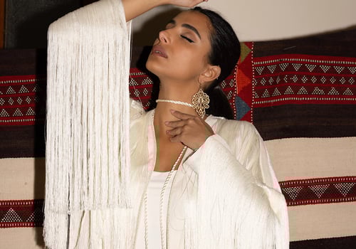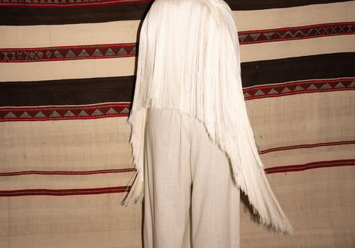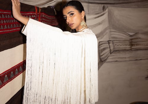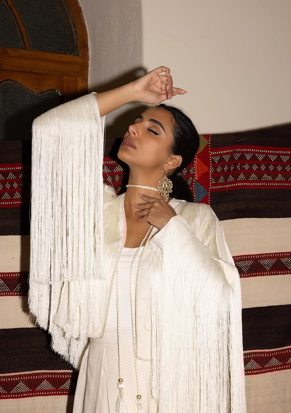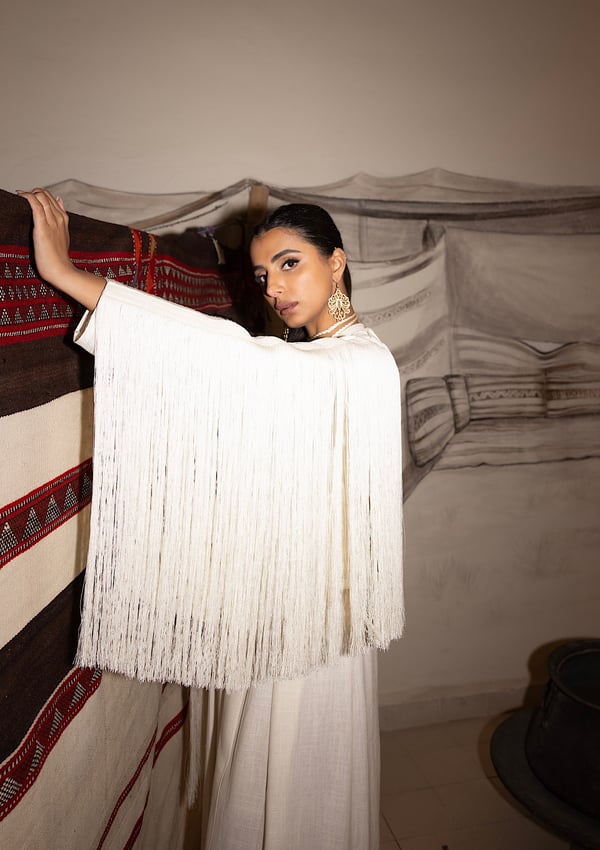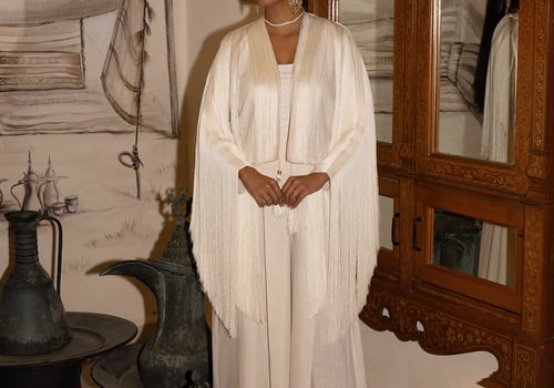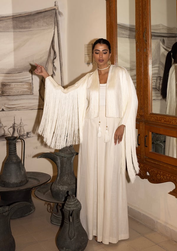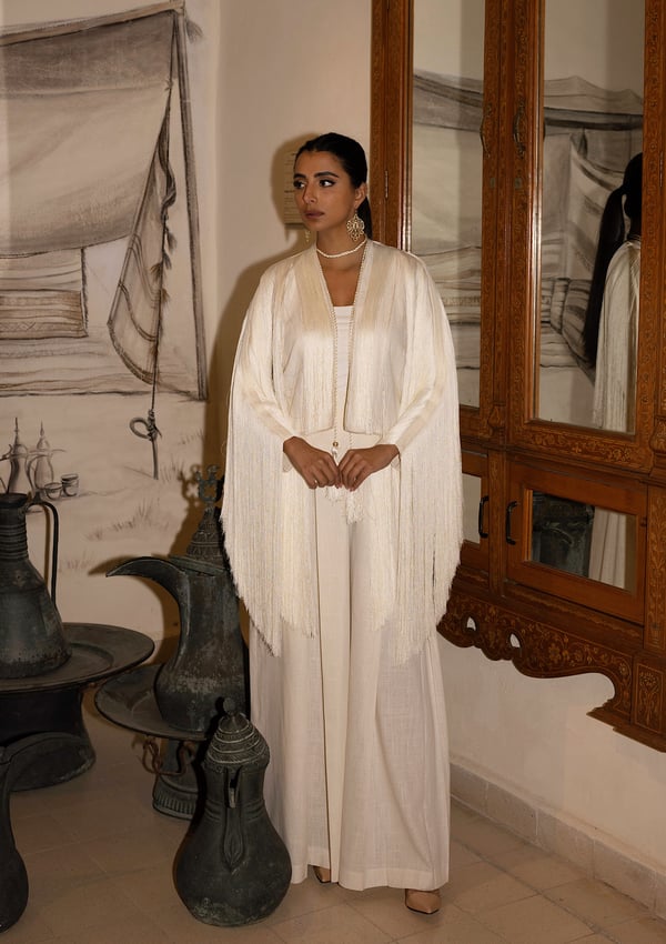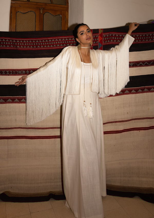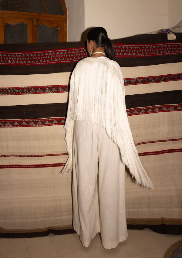 Fringes linen jacket in cream colour with high waist wide leg pant + choker necklace ..