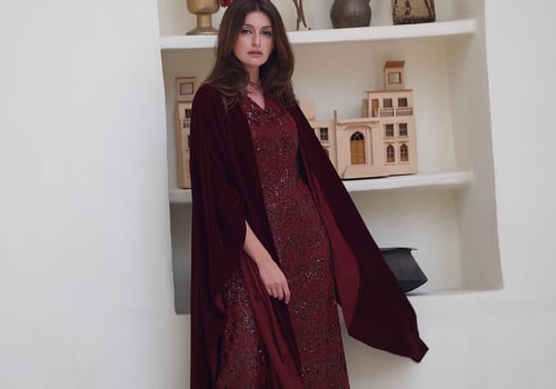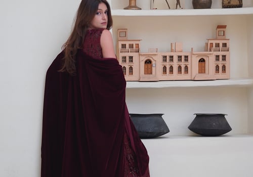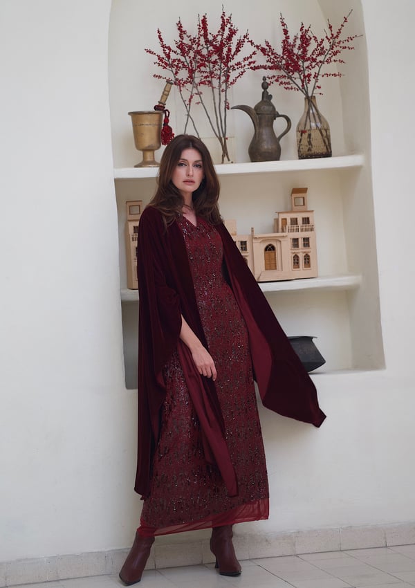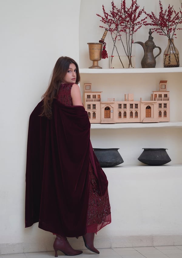 Velvet dress with a chiffon bisht and em...