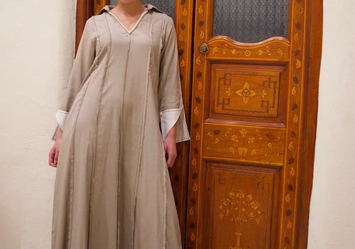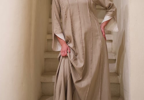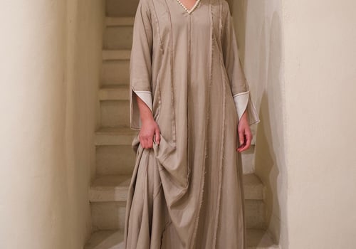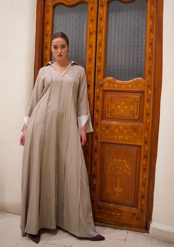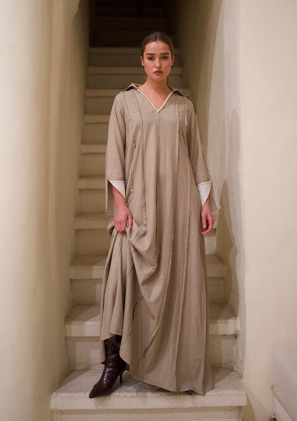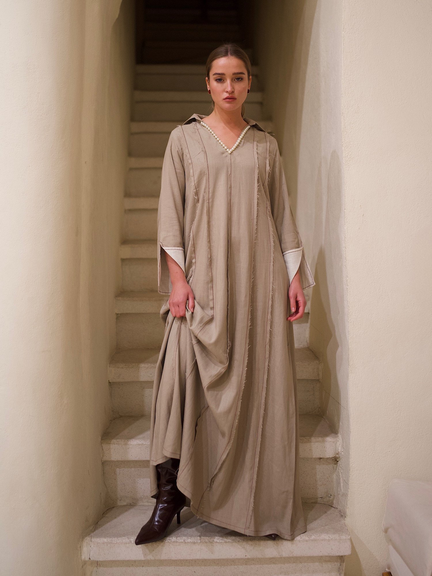 Linen kaftan with a pearl v-neck embroidery